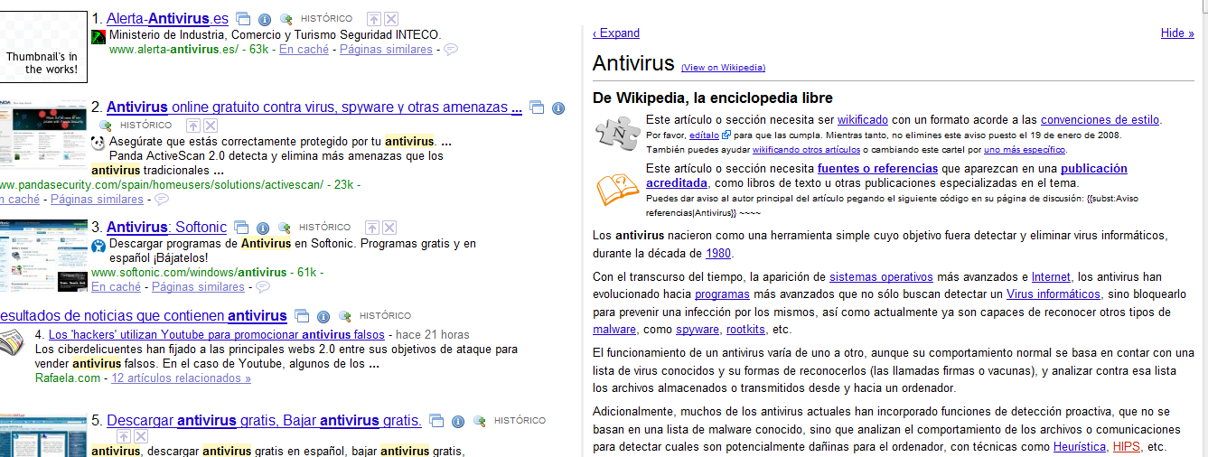 Este complemento permite que se muestre un artículo relevante de la Wikipedia sobre la información que acabes de buscar. Es perfecto para investigar sobre un tema. La integración de Wikipedia se hace en la página de Google en el lado derecho de la página, donde tras realizar una búsqueda se queda acoplado pudiendo consultar los resultados de Wikipedia que nos parezcan más interesantes. Si por el contrario no nos interesa nada podremos ocultar ese lado de pantalla.