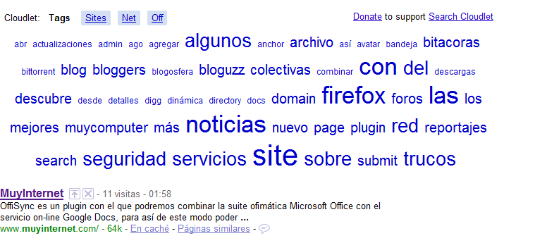 Search Cloudlet es una extensión que trabaja con Google y Yahoo! Cuando escribes un criterio, palabra o frase, en cualquiera de los dos buscadores, aparece en la parte superior de la pantalla una nube de etiquetas que te servirá de sugerencias a la hora de llegar a donde quieres. No únicamente muestra las etiquetas, en la parte superior de la página de resultados verás cuatro enlaces: Tags, Sites, Net y Off. El primero muestra, como su nombre indica, la nube de etiquetas; el segundo una nube con enlaces a los sitios relacionados con los términos de búsqueda; el tercero, Net, una relación de las diferentes extensiones de dominios que muestran resultados, y el cuarto y último permite desactivar Cloudlet.