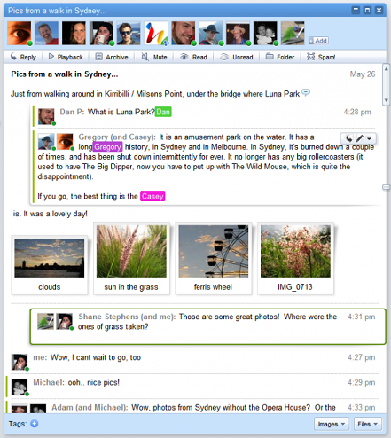 Se trata de un servicio que se ejecuta en el navegador y permite crear conversaciones colectivas en las que se contesta de manera directa al hilo de conversación creado, pero permite, además, incluir mapas, vídeos, fotografías, o enlaces a la conversación. Para añadir a una persona a la conversación basta con tenerla como contacto y arrastrar su imagen de la ventana de contactos al hilo en cuestión. Si esta persona no está conectada podrá ver nuestro mensaje una vez que se conecte, lo que lo acercaría a parecerse al correo electrónico, siendo similar a un software de mensajería instantanea cuando el contacto está on-line.
