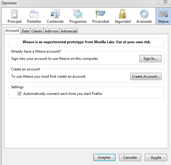 Todo lo que debes hacer para utilizar Mozilla Weave es dirigirte al sitio de descargas, registrarte como usuario y obtenerlo. Una vez instalado dirigirte a Herramientas -> Opciones, y cuando la ventana esté ante ti dirigirte a la pestaña de Weave, que estará ubicada a la derecha, al lado de Avanzadas. Pulsando el botón de Sincronizar, todos los datos de tu Firefox irán al servidor de Mozilla.