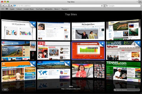 Al igual que ocurre con Google Chrome, la nueva versión del navegador de Apple ofrece una pantalla específica para obtener un rápido acceso a las páginas web que visitas más a menudo (Top Sites). La principal diferencia entre ambos es que el Top Sites de Safari ofrece un renderizado en 3D de los sitios web.