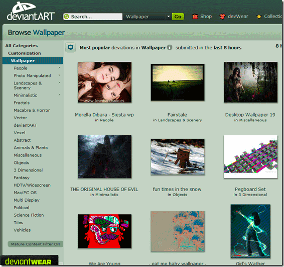 En primer lugar nombran a DeviantArt. Se trata de una web que no requiere un registro previo para poder descargar el fondo de pantalla. Aglutina a una comunidad internacional de artistas en la Red. Es un espacio virtual en el que cada cual puede mostrar su arte y aprovechar las posibilidades de la red para someterlo a los comentarios de cualquiera y en particular de otros artistas. DeviantART está abierta a muchos tipos de artistas pero principalmente los relacionados con las artes visuales y gráficas, como fotógrafos, diseñadores gráficos o pintores, aunque también hay obras literarias realizadas por escritores.