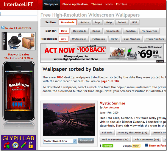 InterfaceLIFT es otra de las webs que no os podéis perder. Es gratuita pero no al completo ya que tendrás que pagar por algunos fondos de pantalla (también hay para móviles). Su colección de fondos ofrece las imágenes a resoluciones muy altas (2.560 × 1.600 máximo) cosa que seguro será del grado de quien tenga un monitor de más de 22 pulgadas. Por otro lado existe una pequeña aplicación gratuita de L|M|TER Inc. Con ella tendremos a nuestro alcance los mejores fondos de pantalla de su web en todas las resoluciones disponibles. Además, podremos cambiar el fondo de nuestro sistema desde el propio programa, de forma sencilla, algo muy cómodo cuando queremos darle un nuevo aire a nuestro escritorio.