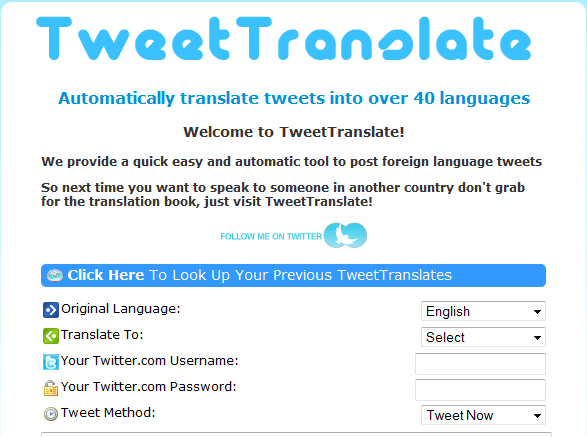 Este problema va a pasar a la historia gracias a Tweettranslate, un traductor de tweets con el que sencillamente podrás enterarte de todo lo que se cuece allí pudiendo traducir los mensajes hasta en 40 idiomas diferentes. Su sistema es muy sencillo, tan sólo tienes que escribir el nombre de usuario y la contraseña de tu cuenta de Twitter y automáticamente insertar el tweet que deseas traducir, el idioma de origen y el idioma al que deseas traducirlo.