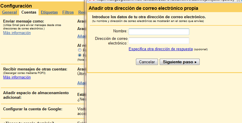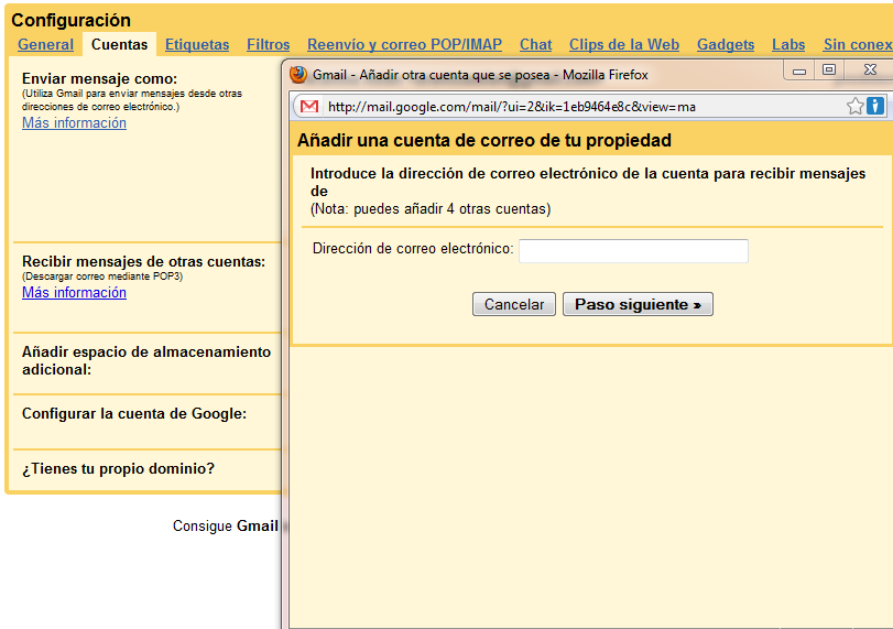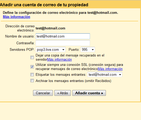 A continuación añade tu dirección de correo de Hotmail en la casilla que aparece y dale clic a siguiente paso. Tras esto se te pedirá que introduzcas tu nombre de usuario, contraseña, tu servidor POP y que elijas algunas otras opciones para la configuración de tu cuenta de Gmail.