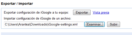 Ahora cuando inicies sesión en tu otra cuenta vuelve al mismo lugar (Exportar/Importar) y pincha en la casilla Examinar para buscar el archivo XML guardado previamente en tu disco duro. Una vez localizado haz clic en Subir.