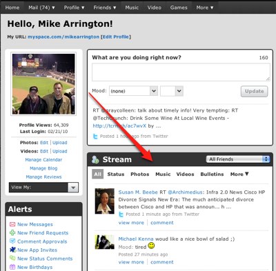 Esta denominada Stream muestra una gran cantidad de contenido en el que se incluyen música que están escuchando nuestros contactos en MySpace Music, vídeos que están visualizando o enlaces que han añadido. La compañía no ha hecho un anuncio oficial de esta nueva prestación, pero es evidente que su incorporación responde a la intención por no quedarse atrás en ciertas funcionalidades respecto a Facebook.