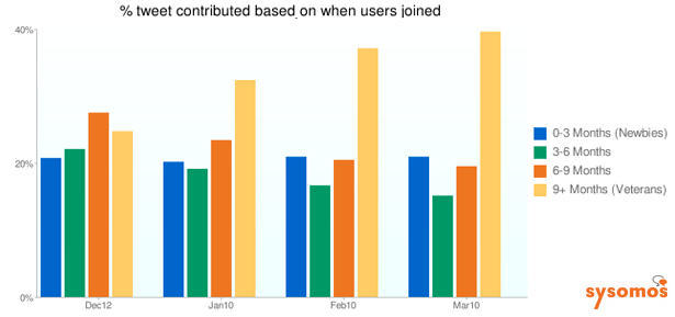 Sysomos, empresa de estudios de medios sociales, ha publicado un estudio que se basa en el análisis de cerca de 1.000 millones de tweets, y que muestra cómo la gente contribuye al servicio en base al tiempo que han estado usando el popular servicio de microblogging.