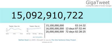 Tres meses después de que Twitter superara la barrera de los 10.000 millones de tweets, el contador GigaTweet ha anunciado que la red de microblogging ya ha llegado a los 15.000 millones de tweets publicados. De hecho Gigatweet calcula que Twitter seguirá acelerando su crecimiento y romperá la barrera de los 20.000 millones de tweets en tan sólo 72 días.