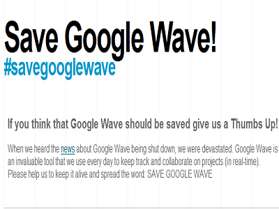 Muchos son los usuarios que han lamentado el cierre del fallido servicio de Google, Wave. Éstos, casi 20.000 fans, han creado una iniciativa a través de una web y una cuenta de Twitter para salvar el proyecto llamada «Salvemos a Google Wave». “Cuando nos enteramos de las noticias acerca de que Google Wave cerraba, nos sentimos devastados”, comentaban algunos de los habituales a Wave.