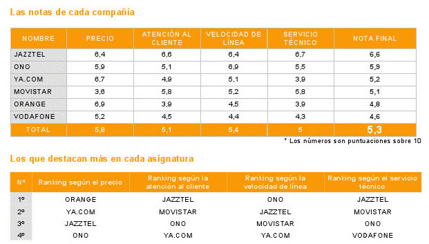 Aunque el precio de la línea es el aspecto que más nota ha sacado (un 5,8), el análisis demuestra que éste no es determinante para la satisfacción del usuario. Y es que la compañía que, según los internautas encuestados, ofrece tarifas más económicas no logra aprobar ni en atención al cliente, ni en velocidad de línea ni en servicio técnico.
