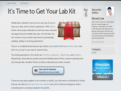 Mozilla Lab ha anunciado la disponibilidad de Lab Kit, una extensión para Firefox 4 Beta que automáticamente agrega, actualiza o quita complementos experimentales desarrollados para Firefox. Todos estos experimentos serán revisados y aprobados por Mozilla Lab antes de ser introducidos en el Lab Kit.