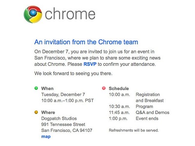 «El 7 de diciembre estás invitado a unirte con nosotros para un evento en San Francisco, donde planeamos lanzar excitantes noticias acerca de Chrome. Esperamos verte allí», reza el comunicado que la compañía ha repartido a los medios. Algunas fuentes como Engadget apuntan que también podría tratarse de la presentación de un ultraportátil con el nuevo sistema integrado.