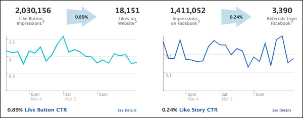 De este modo, ahora, por primera vez, podemos tener acceso a análisis en tiempo real para conocer los datos que se ofrecen a partir de los botones Me gusta y Compartir, pudiendo saber cuántas veces fue compartido un contenido en la red social, la cantidad de impresiones que obtuvo y cuántos pulsaron sobre los enlaces para ingresar a nuestro sitio.