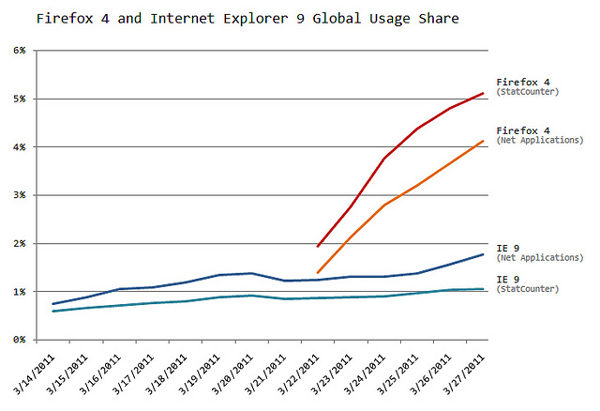 Con muy poco tiempo de diferencia entre ambos, Firefox 4 está ganando terreno a Internet Explorer 9, una de las mejores versiones de Microsoft, que parece está quedando algo eclipsada por el zorro de Mozilla.
