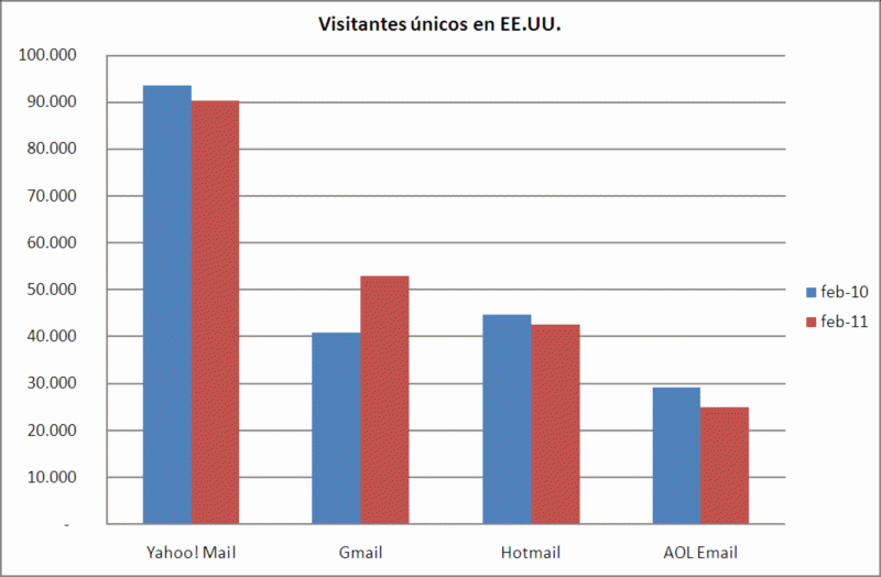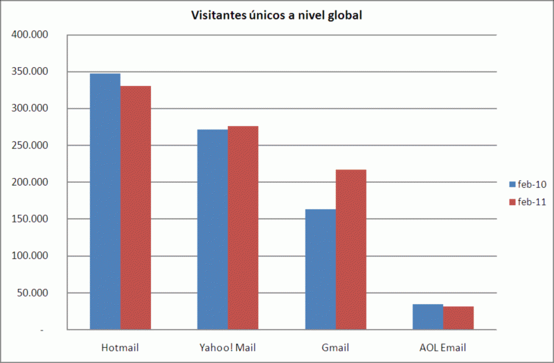 Como decimos, a nivel mundial el servicio más utilizado sería Hotmail, aunque habría experimentado una bajada del 5% con respecto al año anterior. El segundo puesto, a nivel mundial, lo ocuparía Yahoo! Mail que, además, experimenta un crecimiento del 2% con respecto al año 2010. Sin embargo, si hay un servicio que ha experimentado un aumento impresionante es Gmail, con un crecimiento del 33%.