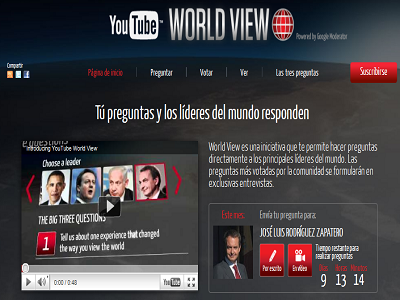 YouTube ha lanzado un programa muy interesante bajo el nombre de YouTube World View mediante el cual líderes de todo el mundo se someten a las preguntas de los ciudadanos. Obama, David Cameron o Benjamin Netanyahu ya han acudido a la cita, la próxima será el 27 de abril con el presidente del Gobierno de nuestro país José Luis Rodríguez Zapatero.