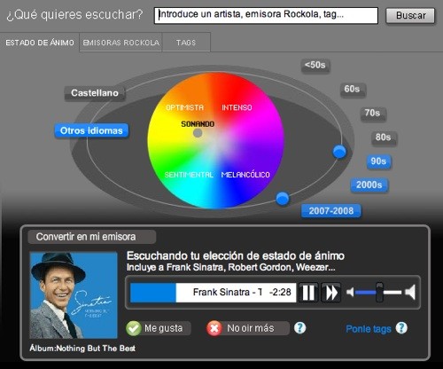 Este es un interesante experimento, porque es tan bueno para escuchar música que te gusta, como para descubrir música similar a tus gustos. Puedes buscar por estilo y época, como en Musicovery y también puedes buscar por artista. En Rockola.FM no puedes elegir una canción específica, sino que va reproduciendo canciones del artista elegido y, en medio, pasa artistas similares, los cuales puedes gustar o no.
