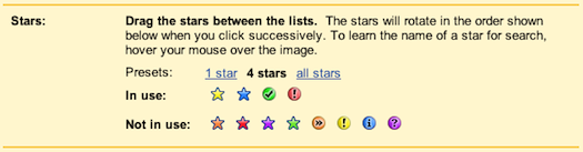 Para los que andéis algo despistados, os recordamos para que sirven cada una de ellas. Por un lado, superestrellas permite asignar diferentes tipos de estrellas a los correos. Para poder usar varias estrellas habrá que ir a la sección estrellas en Configuración>General. Allí podremos seleccionar entre usar una, usar cuatro o usar doce. ahora podemos escoger el ícono haciendo clic repetidamente sobre la estrella.