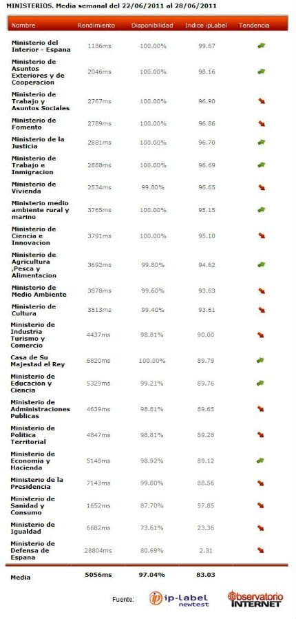 Por encima está el Ministerio de Interior ,el Ministerio de asuntos exteriores y de cooperación y el de Ministerio de trabajo y asuntos sociales. Sus datos son bastante buenos; 1.186 milisegundos, 2.046 milisegundos y 2.767 milisegundos, respectivamente.