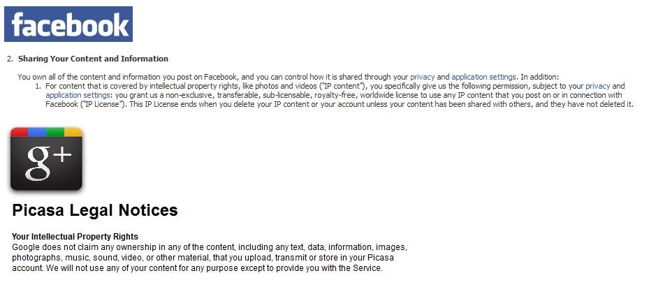 En el caso de lo Google Plus y Picasa -el servicio de fotografías de Google-, la política de privacidad comenta «Google no reclama ningún derecho de propiedad de los contenidos incluidos textos, información, datos, imágenes, música o vídeos que se puedan transferir por el servicio».