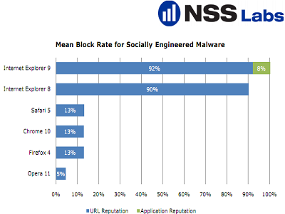 Un estudio elaborado por NSS Labs, ha concluido que Internet Explorer 9 puede eliminar hasta el 92% del malware de ingeniería social, lo que lo convierte en el navegador más eficaz contra este tipo de malware. Para este estudio, NSS Labs probó un total de 615 URLs maliciosas durante un período de 19 días.