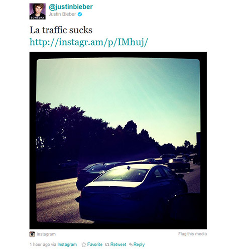 Justin Bieber utilizó su cuenta oficial de Twitter para retransmitir sus impresiones sobre el tráfico. Para ello, colgó la fotografía que podemos ver a continuación usando Instagram. Como se puede observar no tiene demasiado de especial pese a que sus seguidores no opinan lo mismo. Menos de una hora después de hacer este twitteo ya contaba con más de 1.700 seguidores, según confirmó Kevin Systrom, confundador de Instagram.