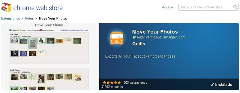Al accionarlo, se pedirá a los usuarios que autoricen la aplicación en Facebook y que accedan a su cuenta de Picassa. Tras esto, podrán ir a Move your Photos para seleccionar las fotografías de Facebook que quieren exportar a Picassa. Automáticamente, los contenidos seleccionados aparecerán entre las fotos de los usuarios en Google +.