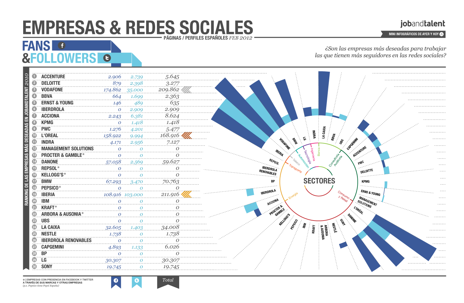 En cuanto a las empresas que más seguidores cuentan en Facebook y Twitter, jobandtalent ha constatado que no se corresponden con las que en su día lideraron el ranking de empresas más deseadas para trabajar. Así, Iberia es la que más seguidores tienen en las redes sociales, con 211.916 fans, mientras que en el ranking de interés para los profesionales ocupaba el puesto 19.