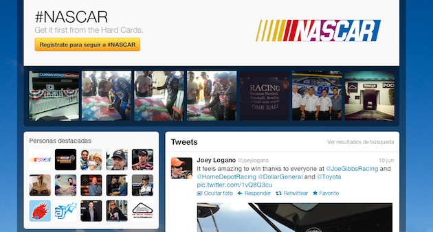 Por este motivo y viendo su potencial, Twitter ha decidido ofrecer páginas personalizadas para dichas etiquetas. La idea es que la página que muestre todas esas opiniones pueda ser personalizada y caracterizada con la estética y la imagen del que organiza un evento concreto. Para ilustrar esta nueva opción y demostrar su potencial, Twitter ha anunciado el lanzamiento de la página del ‘hashtag’ de #Nascar. Si los usuarios entran en ese ‘hashtag’ verán que son redirigidos a una página personalizada, en la que se pueden ver los contenidos que incluyen dicha etiqueta, organizados de una forma distinta a la que suele presentarse para ‘hashtag’ genéricos.