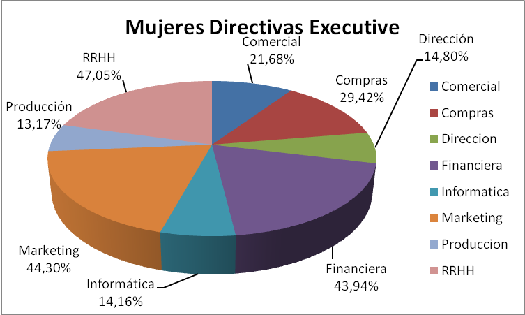 Los datos reflejan un claro posicionamiento de mujeres Directivas Executive en, como decimos, las áreas funcionales de Recursos Humanos en la que el 47,05% del total son féminas, seguida por los puestos de Marketing y Finanzas con 44,30 % y 43,94% respectivamente. También cabe destacar un pequeña presencia en los departamentos de Compras y Comercial. Otras áreas como Producción o Informática siguen manteniendo la preponderancia masculina, viéndose representados únicamente en un 13, 17% y un 14,16%, respectivamente, por mujeres.