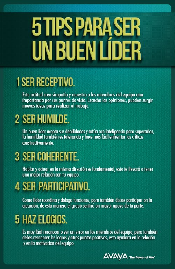 Desde Ticsyformación nos llega una infografía en la que nos dan unos consejos para llegar a ser un buen líder. Quizá ya has puesto en práctica algunos, ahora sólo te queda afinarlos.