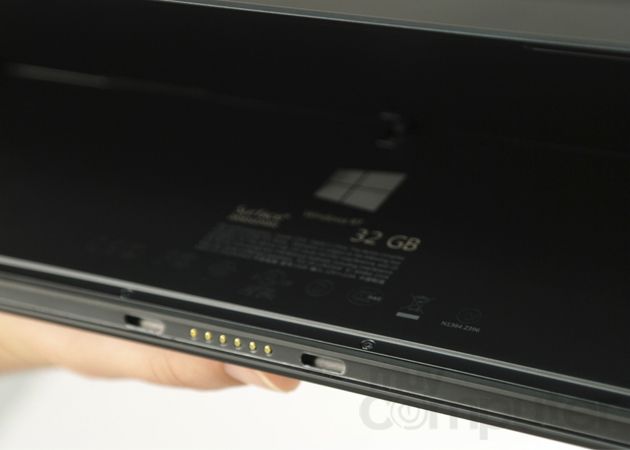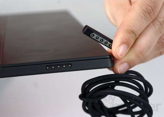 En los lados del dispositivo podemos pasar revista a los conectores. En la parte inferior encontramos uno magnético de seis contactos que nos permitirá conectar y alimentar dispositivos (por ahora solamente las Type y Touch covers, las fundas con teclado de Microsoft). En la parte inferior derecha encontramos otro conector magnético, esta vez de cinco pines, que conecta al alimentador. Microsoft ha optado por un conector tipo magnético descartando la solución MicroUSB estándar.