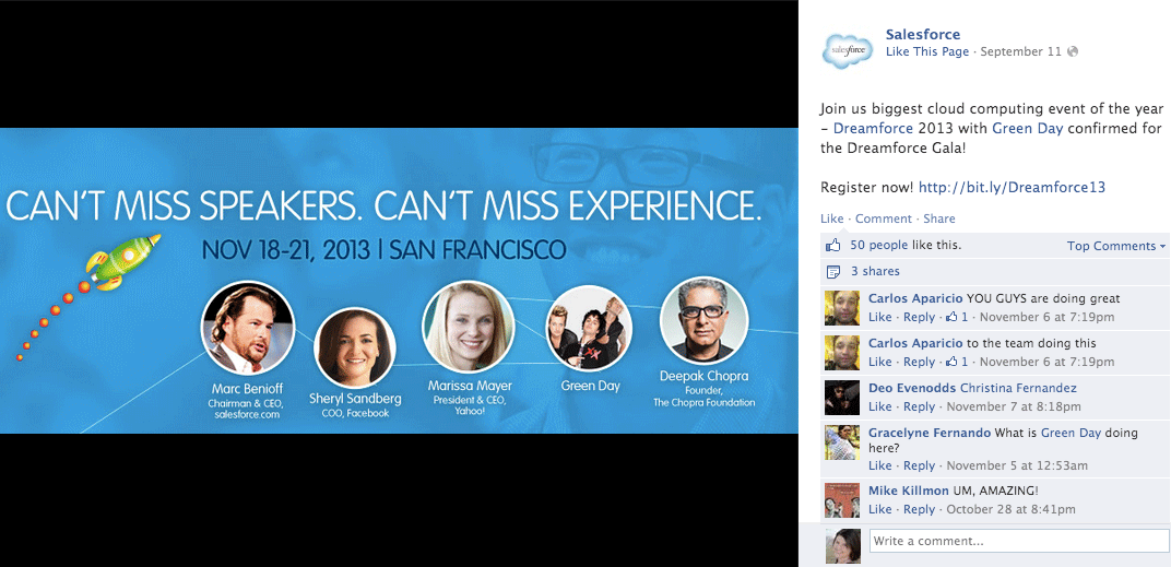 Hay algunas maneras de hacer esto. Lo primero es usar la foto de portada como un anuncio e incluir un enlace en la descripción de la foto . De esta manera, cuando los usuarios hagan clic en la foto, obtendrán más información. Es lo que Salesforce hace para anunciar su próxima conferencia: