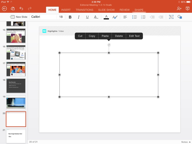 Llama sin embargo poderosamente la atención que se haya eliminado la posibilidad de imprimir documentos, por mucho que desde iOS sea perfectamente posible utilizando AirPrint. En el caso de Office, no nos será posible hacerlo. Más allá de lo anterior, sí que creemos que son las imágenes las que mejor os van a mostrar cómo es el nuevo Office y en este sentido os animamos a que no os perdáis ningún detalle de la galería que hemos preparado para vosotros, utilizando como fuente el estupendo trabajo que han hecho en Mashable.