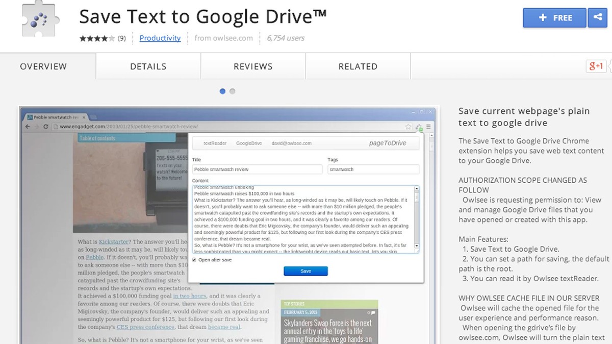 Esta extensión es muy útil para guardar texto directamente de la web sin más contenidos que no sea lo que seleccionemos, pues se creará un documento desde cero que se guardará en nuestro espacio de Drive.