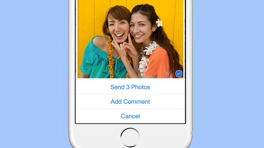 Al otro lado del campo de texto está el icono estándar para la cámara. Puedes tocarlo para ver la pantalla que te permite mandar una foto o vídeo. Ahora, la pantalla tiene miniaturas para darte acceso más rápido al carrete de fotos junto a las mismas opciones que ya han estado disponibles en iOS. Si mantienes presionado el icono de la cámara, ésta se iniciará instantáneamente, y estará lista para tomar autorretratos. Desliza el dedo sobre el icono de la cámara para capturar una foto, o desliza sobre el botón de grabación para tomar un video rapidito.