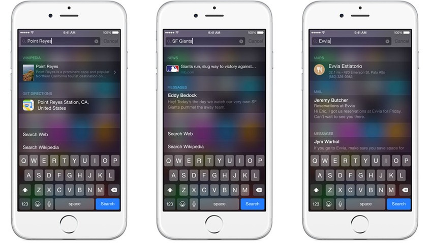 Spotlight, al que todavía se accede arrastrando la parte superior de la pantalla hacia abajo, es una herramienta de búsqueda significativamente más inteligente que nunca. Además de buscar cosas en tu propio dispositivo, ahora también busca en la Wikipedia, sabe qué temas online son de rabiosa actualidad en tiempo real, muestra restaurantes cerca y te dice hasta los horarios del cine.