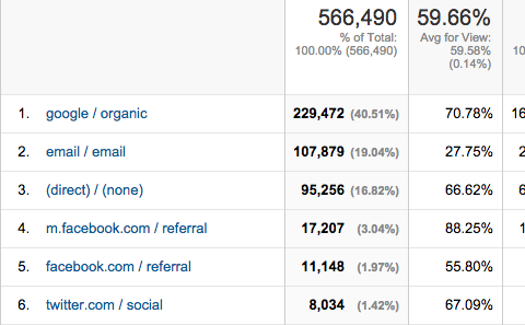 ¿Sabes cuál es el recurso que te trae más tráfico? No son las redes sociales o los visitantes directos. Es Google. Y si no lo es, significa que no has pensado en el SEO. Basta con mirar la siguiente imagen: muestra que Google supone el 40.51% del tráfico de Quick Sprout.