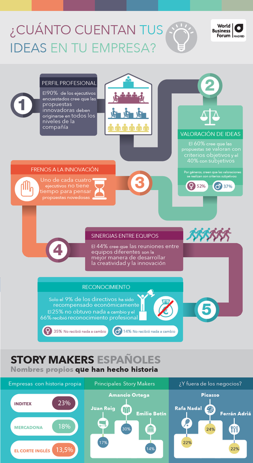 Las respuestas de los 400 ejecutivos españoles que han participado en el sondeo se centra en la procedencia de las ideas, la sensación que experimentan los ejecutivos al proponerlas, los frenos con los que se encuentran, la recompensa recibida y los canales existentes en sus compañías para hacerlo.