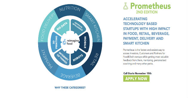 Reimagine Food, centro innovador en alimentación y tecnología, ha puesto en marcha la segunda edición de Prometheus, una nueva convocatoria que ofrecerá a los ganadores hasta 300.000 euros de inversión para sus proyectos vinculados con la tecnología, la gastronomía o ambas a la vez. Esta convocatoria está especialmente dirigida a startups y emprendedores para atraer el talento nacional e internacional y dar a conocer las más novedosas iniciativas del sector a inversores y público general.