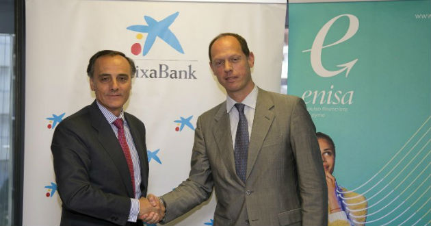 Bruno Fernández, consejero delegado de Enisa, y Juan Gandarias, director territorial de CaixaBank en Madrid, han suscrito hoy un convenio de colaboración para facilitar la financiación a las empresas adheridas a Enisa, empresa pública dependiente del Ministerio de Industria, Energía y Turismo que impulsa la creación, crecimiento y consolidación de empresas. De este modo, las pymes beneficiarias de las líneas de Enisa, que cuenta con préstamos comprendidos entre 25.000 euros y 1.500.000 euros, destinadas a emprendedores y pymes, sin más avales y garantías que las del propio proyecto empresarial, tendrán acceso en condiciones preferentes a la financiación ofrecida por CaixaBank.