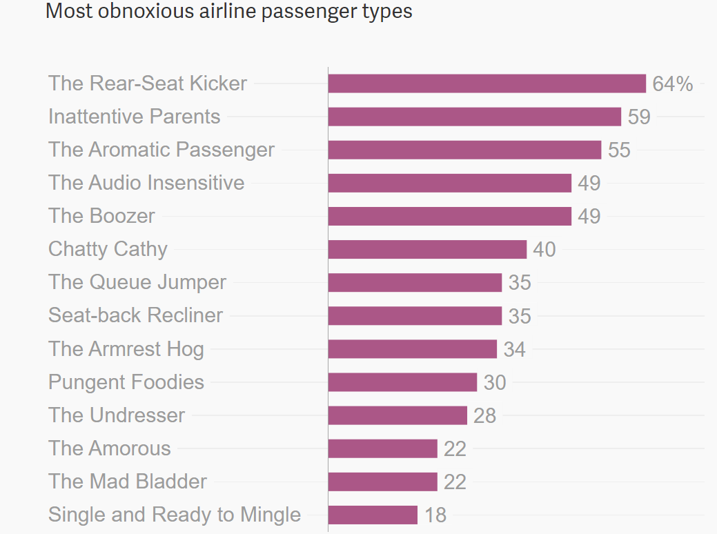 Según la conocida agencia de viajes, el hábito desagradable que gana por goleada (64%) corresponde a aquellos que clavan sus rodillas (cuando no directamente sus pies) en el respaldo de la butaca, en esa lucha silenciosa que se produce entre los que pese a lo reducido del espacio, se empeñan en bajar el respaldo (un hábito que molesta al 35% de los encuestados) y los anteriores.