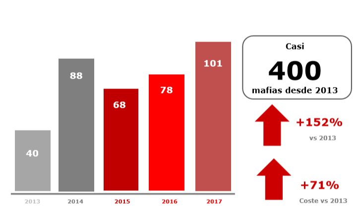 Más de 400 bandas mafiosas cuyo principal objetivo es estafar al seguro. Es lo que ha destacado Línea Directa en los últimos cuatro años. La aseguradora, que acaba de presentar su «IV Barómeto del Fraude en el Seguro de Autos» ha explicado que de media, estas mafias suelen tener entre 3 y 4 cabecillas y los importes medios de sus estafas superan los 12.000 euros por siniestro (diez veces más que el fraude que se comete de forma individual).