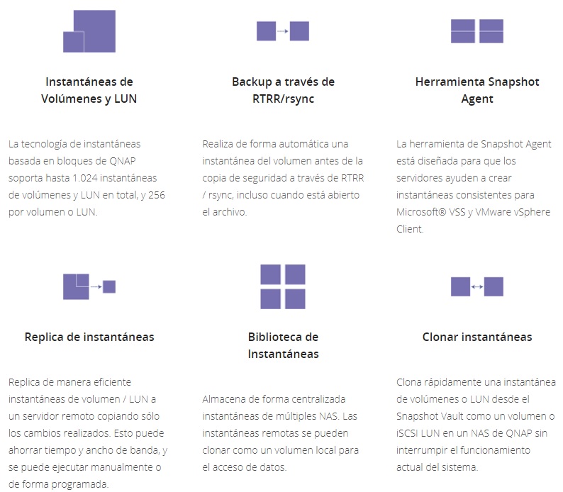 En el caso de las instantáneas que utiliza QNAP en sus NAS profesionales nos encontramos con un sistema que puede realizar de forma simple copias de seguridad del estado del sistema en diferentes momentos. Esto le permite trabajar como un sistema de respaldo de datos perfectamente ordenado, ya que a partir de ellos podremos realizar recuperaciones de manera segura y rápida eligiendo el momento temporal que mejor se ajuste a las necesidades de nuestra empresa.