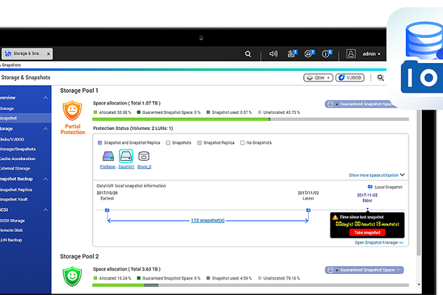 El «Gestor de Almacenamiento» («Storeage Manager») de QNAP integra numerosas herramientas que permiten realizar instantáneas y restaurar archivos y datos según sea necesario. Los archivos individuales se pueden restaurar fácilmente si se eliminan accidentalmente o se reescriben, y todo el sistema se puede revertir fácilmente a un estado anterior que sea considerado como mejor o más apropiado para nuestra empresa.