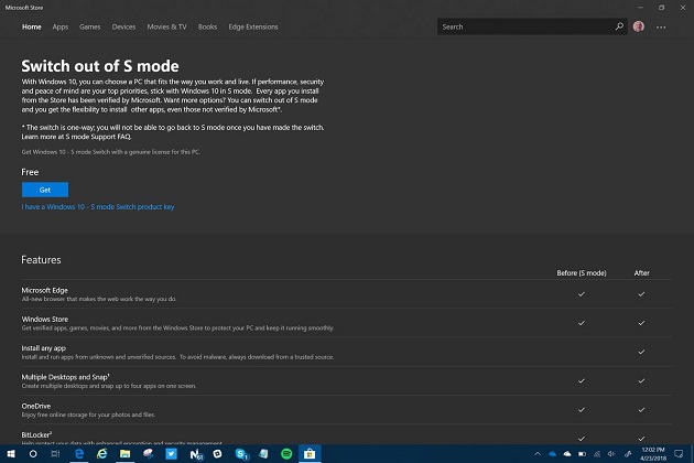El caso es que para facilitar la integración de esa nueva opción hemos podido confirmar que Microsoft dará la opción de desactivar el modo S en Windows 10 a través de la Windows Store, y sin ningún tipo de coste. Es una buena idea ya que simplifica el proceso al permitir al usuario realizarlo directamente a través de una sencilla búsqueda en al tienda de aplicaciones y suponemos que también darán la opción inversa.