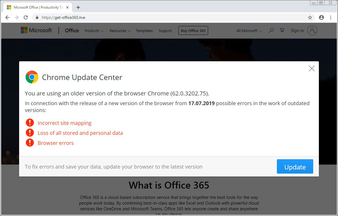 Los cibercriminales han puesto de nuevo el ojo en los usuarios de Office 365. Un nuevo ataque de phishing que gira alrededor de una página web falsa de dicha suite de ofimática está circulando a lo largo y ancho de Internet con un objetivo claro, engañar al usuario para que instale una supuesta actualización para su navegador.