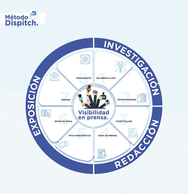 El Método Dispitch es el resultado de 15 años de experiencia trabajando con periodistas y es la filosofía sobre la que se asienta la propia herramienta Dispitch.io. Se trata de ocho pasos que te ayudarán a conectar con los periodistas adecuados y, sobre todo, conseguir esa visibilidad en prensa tan deseada.