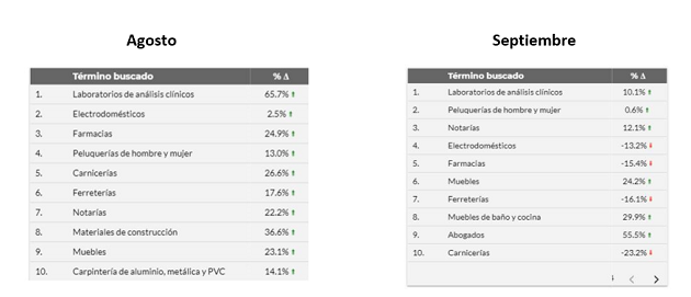 En cuanto al resto de categorías, en agosto completaban el podio los electrodomésticos y las farmacias, con un aumento en el volumen de búsquedas de un 2,5% y un 24,9% respectivamente. En cambio, durante septiembre, los negocios relacionados con las peluquerías para hombre y mujer volvían a la segunda posición, siendo las notarías la tercera categoría más buscada con un incremento en las búsquedas del 12,1%.